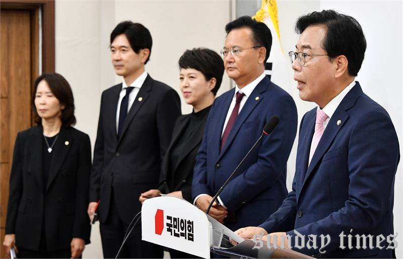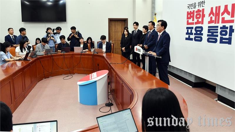 [선데이타임즈=윤석문 기자]국민의힘 신임 비상대책위원장으로 선임된 송언석 원내대표가 1일 오전 서울 여의도 국회에서 열린 기자회견에서 “집권여당이 야당에 전면전을 선포하고 의회 폭주에 시동을 걸었다. 핵심 상임위원장인 일방적 독식에 이어 추경안의 졸속 처리, 노란봉투법과 양곡관리법을 비롯한 40여 개 쟁점 법안, 방송 장악을 위한 방송 3법, 검찰 해체 법안 등 국가의 기본적 체계를 흔들 수 있는 위험한 입법안의 강행 처리를 예고하고 있다”라며, “국민과 함께 단호하게 맞서 싸우겠다. 국가 경제에 해악을 끼치고 국론분열 초래하는 악법은 총력을 다해 저지하겠다”라고 밝히며, 발언하고 있다.