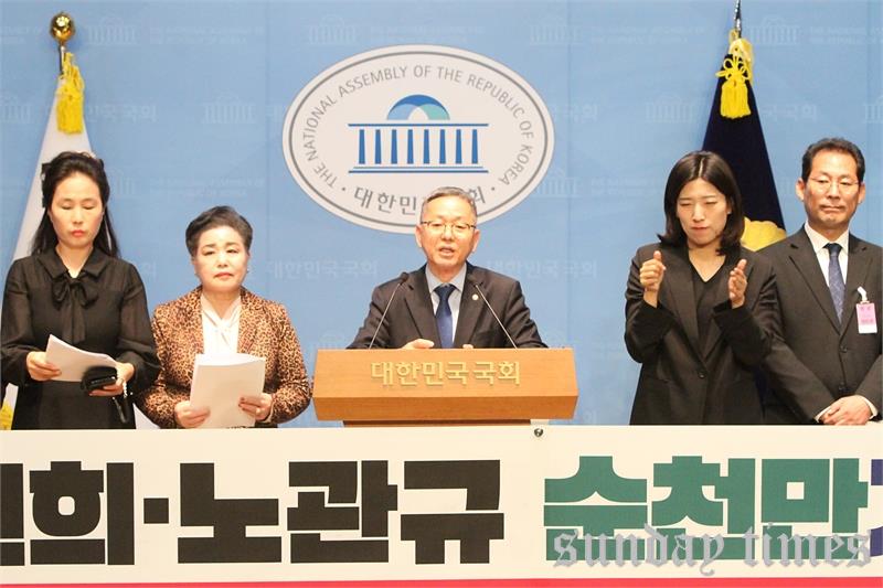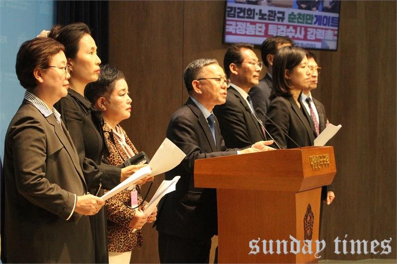[선데이타임즈=윤석문 기자]김문수 더불어민주당 의원이 14일 오후 서울 여의도 국회 소통관에서 김건희 특검 요청 범 순천시민 연대와 함께 ‘김건희노관규 순천만게이트 특검수사’를 촉구하는 기자회견에서 발언하고 있다.