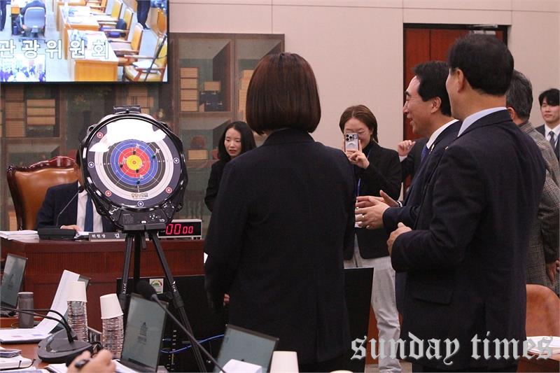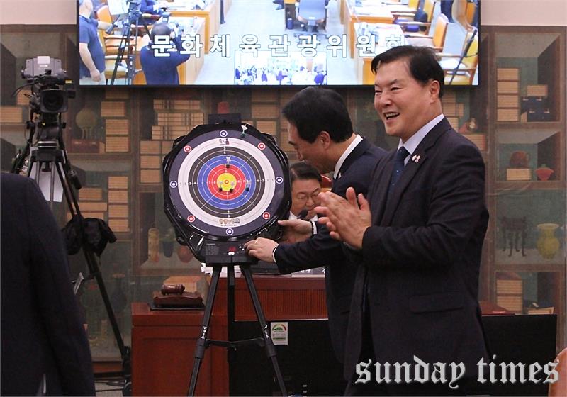 [선데이타임즈=윤석문 기자]국회 문화체육관광위원회 김교홍 위원장이 29일 서울 여의도 국회에서 열린 문화체육관광위원회의 문화체육관광부 및 산하기관에 대한 종합감사에서 박수현 의원이 제안한 한궁 시연 투구를 하고 있다.