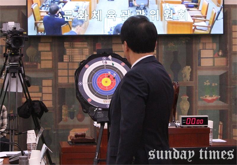 29일 서울 여의도 국회에서 열린 문화체육관광위원회의 문화체육관광부 및 산하기관에 대한 종합감사에서 한궁 시연 투구를 마치고 점수를 확인하고 있는 박수현 의원