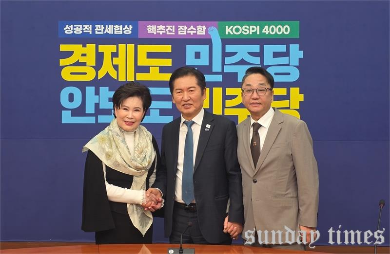 지난 17일 서울 여의도 국회에서 열린 정청래 더불어민주당 대표와 문신업계 단체장 간담회를 마치고 기념촬영을 하는 이선심 미용사중앙회 회장(좌측), 정청래 더불어민주당 대표(중앙)와 황종열 회장(우측)