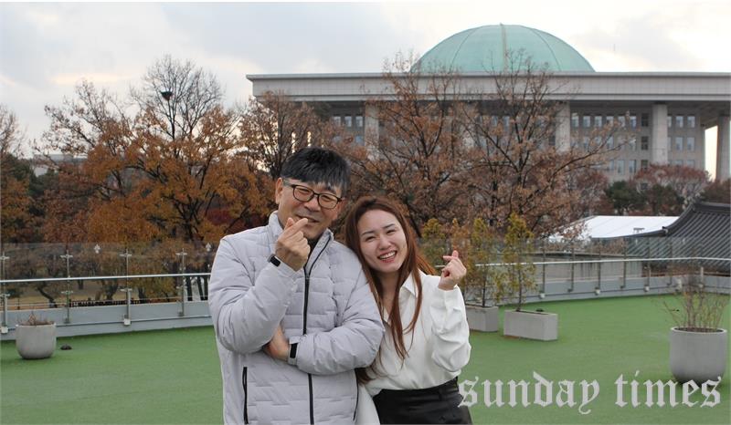지난 27일 서울 여의도 국회 강변서재에서 인터뷰를 마치고 국회 배경으로 기념촬영을 하고 있는 DH엔터테인먼트 김동희 대표(좌측)와 가수 김진솔(우측)