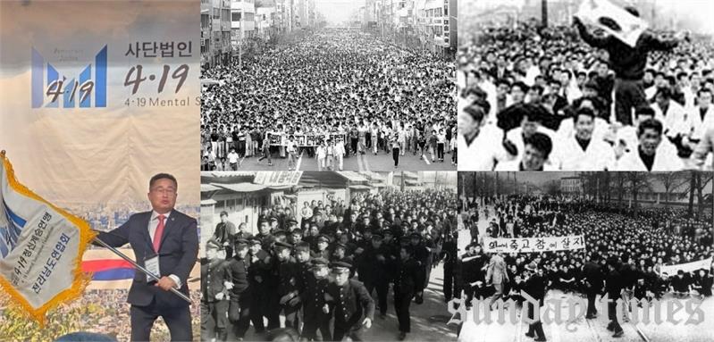 12월 5일 목포시 수산유통센터 2층에서 열린 전라남도연합회 발대식에서 연맹 기를 흔들고 있는 김승호 4.19정신계승연맹 전라남도연합회장(좌측)과 1960년 이승만 정권의 부정선거와 독재에 맞선 학생·시민 주도의 민주화 운동인 4.19혁명(우측)<사진=블로그 캡쳐>