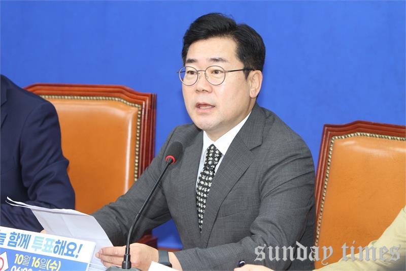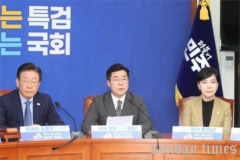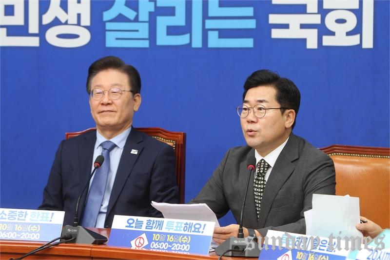 [선데이타임즈=윤석문 기자]박찬대 더불어민주당 원내대표가 16일 오전 서울 여의도 국회에서 열린 최고위원회의에서 “이 대화에서 ‘오빠’는 누가 봐도 윤석열 대통령으로 이해되지 않나. 그런데 대통령실은 카카오톡 대화의 ‘오빠’는 김건희 여사의 친오빠라고 주장했다”라며, “그 오빠가 누구인지 대통령실 말고 김건희 여사가 직접 답하라”고 발언하고 있다.
