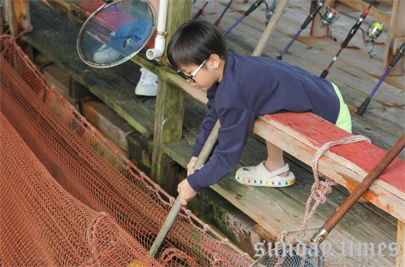 26일 오후 충남 서산시 부석면 창리포구의 해양낚시터에서 자신이 잡은 고기를 뜰채로 올리고 있는 어린이