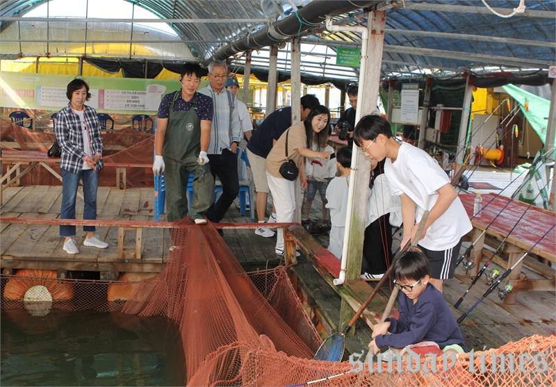 [선데이타임즈=서영민 기자]바다 위에서 낚시를 즐기고, 파도 소리를 들으며 하룻밤을 보낼 수 있는 해상펜션이 있는 충남 서산시 부석면 창리포구의 해양낚시터에서 26일 오후 낚시를 즐긴 가족들이 낚시로 잡은 고기를 들어 보이고 있다.
