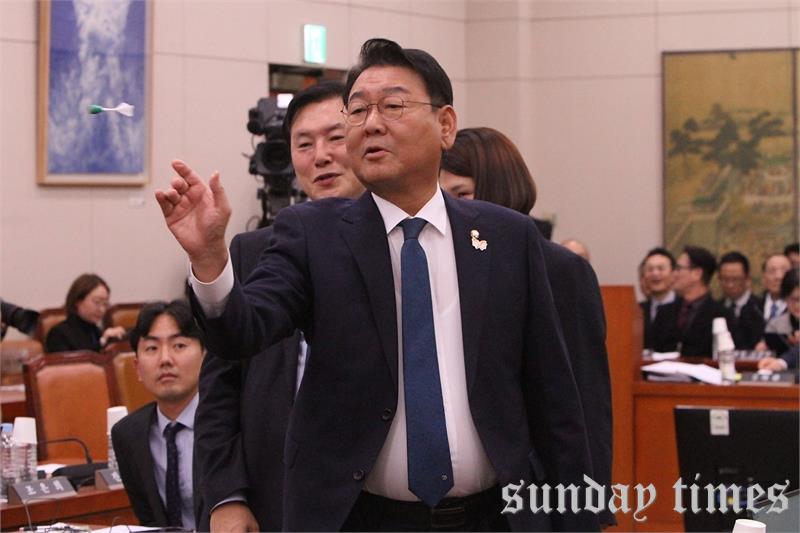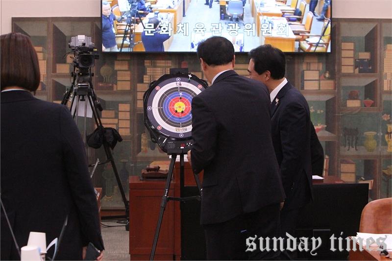 [선데이타임즈=윤석문 기자]국회 문화체육관광위원회 김교홍 위원장이 29일 서울 여의도 국회에서 열린 문화체육관광위원회의 문화체육관광부 및 산하기관에 대한 종합감사에서 박수현 의원이 제안한 한궁 시연 투구를 하고 있다.