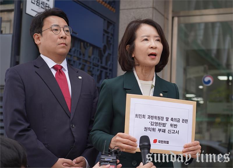 [선데이타임즈=윤석문 기자]국민의힘은 딸 결혼식 명목으로 8인에게 각 100만원씩 800만원 상당의 축의금을 받은 최민희 과방위원장에 대해 ‘김영란법(부정청탁 및 금품 등 수수의 금지에 관한 법률)’ 위반 혐의로 국민권익위원회 정부합동민원센터에 신고서를 제출했다.