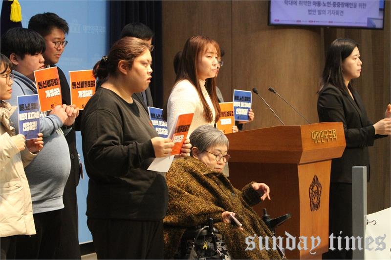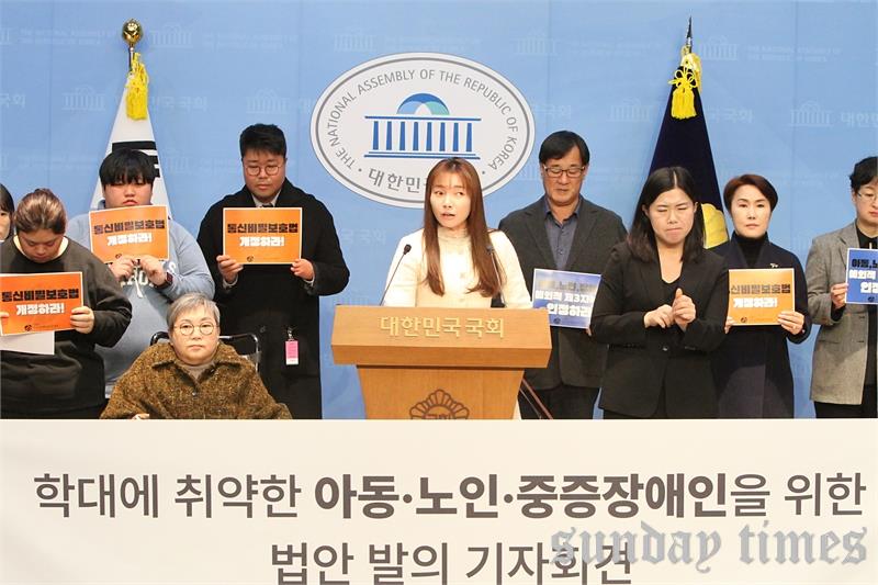 [선데이타임즈=윤석문 기자]국회 보건복지위원회 소속 김예지 국회의원(국민의힘)이 19일 오전 서울 여의도 국회 소통관에서 열린 기자회견에서 “학대에 취약한 아동·노인·중증장애인의 권리 구제를 위한 ‘아동학대범죄의 처벌 등에 관한 특례법’, ‘노인복지법’, ‘장애인복지법’ 및 ‘통신비밀보호법’ 일부 개정법률안을 대표발의했다”라고 밝히며, 발언하고 있다.