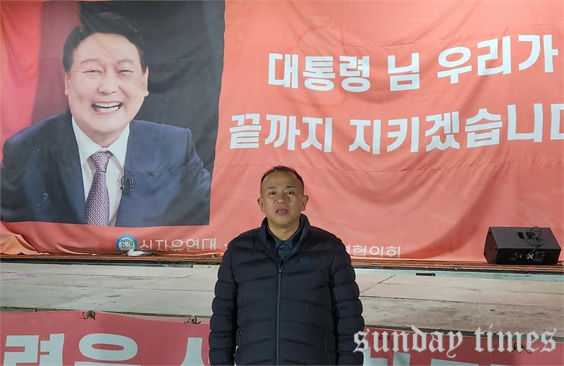 11월 28일, 서울구치소 앞 시위현장에서 인터뷰하는 명태균 정치 컨설턴트
