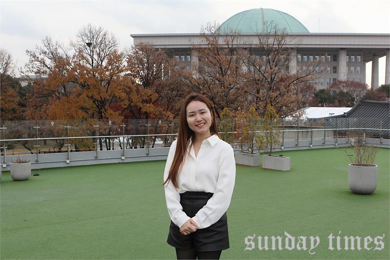지난 27일 서울 여의도 국회 강변서재에서 인터뷰를 마치고 국회 배경으로 기념촬영을 하고 있는 가수 김진솔