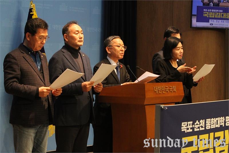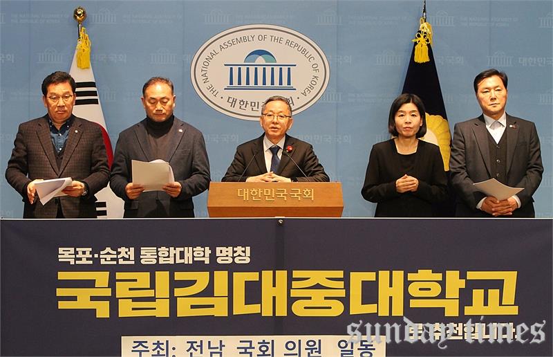 [선데이타임즈 =윤석문 기자]김문수 더불어민주당 의원이 9일 오전 서울 여의도 국회 소통관에서 열린 기자회견에서 전남 동부권을 대표하는 순천대와 전남 서부권을 대표하는 목포대의 통합 대학 명칭에 대해 “통합 대학의 정체성과 미래 비전을 담을 교명으로 ‘국립김대중대학교’를 공식 제안드린다”라며, “‘국립김대중대학교’는 통합 대학이 지향해야 할 가치와 미래 전략을 담은 상징적 이름”이라고 밝히며, 발언하고 있다.