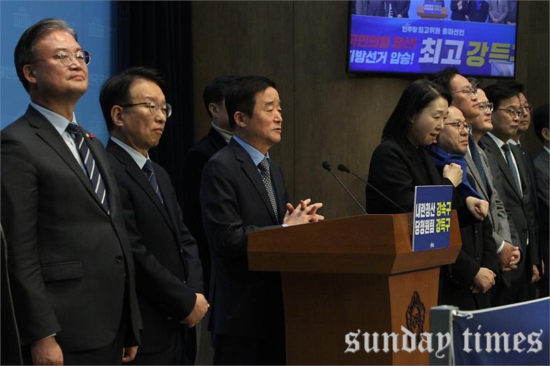 [선데이타임즈=윤석문 기자]강득구 더불어민주당 의원이 15일 오전 서울 여의도 국회 소통관에서 열린 더불어민주당 최고위원 출마선언 기자회견에서 “이재명정부 성공, 국민의힘 청산, 지방선거 압승을 이뤄내겠다”라고 밝히며, 발언하고 있다.