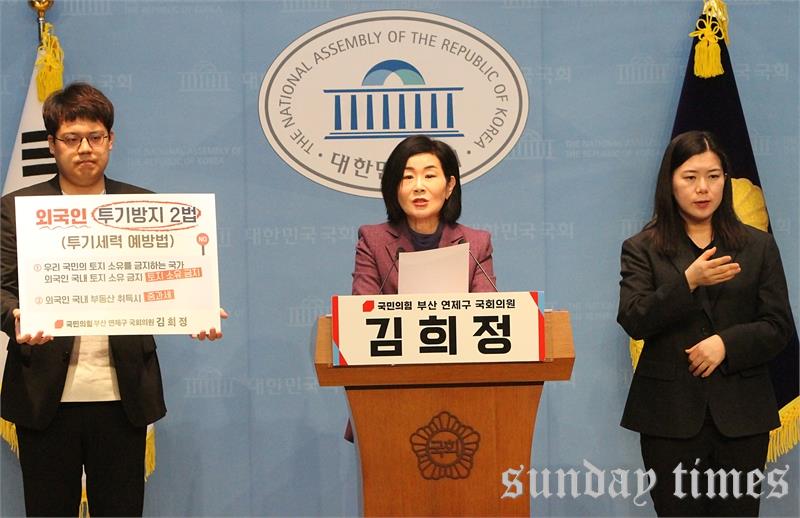 [선데이타임즈=윤석문 기자]김희정 국민의힘 의원이 8일 오전 서울 여의도 국회 소통관에서 열린 ‘외국인 전세보증금 먹튀 및 부동산 투기 방지법’ 관련 기자회견에서 “최근 전세 사기 피해가 심각한 사회 문제로 대두되는 가운데, 외국인 임대인이 국내에서 주택을 매입한 뒤 전세보증금을 돌려주지 않는 이른바 ‘외국인 전세금 먹튀 사기’가 최근 4년간 33배나 급증했고, 작년 한 해 사고 금액만 99억원에 달한다”라고 밝히며, 발언하고 있다.