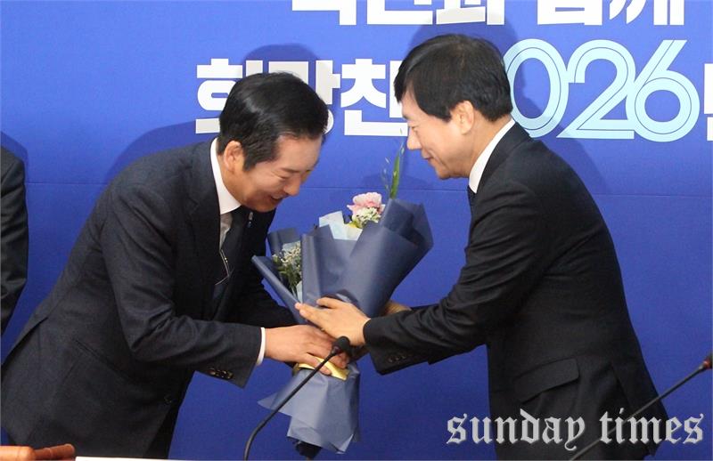 포토 이성윤 최고위원에게 꽃다발 전달하는 정청래 대표 윤석문 승인 2026.01.12 10:54 0 [선데이타임즈=윤석문 기자]정청래 더불어민주당 대표가 12일 오전 서울 여의도 국회에서 열린 최고위원회의에 앞서 이성윤 신임 최고위원에게 꽃다발을 전달하고 기념 촬영을 하고 있다. 12일 오전 서울 여의도 국회에서 열린 최고위원회의에 앞서 이성윤 신임 최고위원에게 꽃다발을 전달하는 정청래 대표 0 0 선데이타임즈 윤석문 smyun2000@hannail.net 윤석문의 기사 더보기 저작권자 ⓒ선데이타임즈, 무단전재 및 재배포 금지